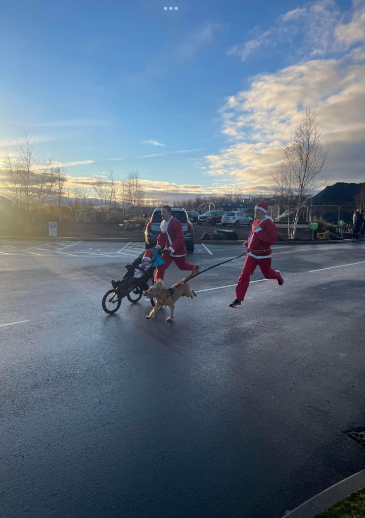 With the Saturday arriving before the big race on the Sunday, I wasn’t feeling in top form and knowing that competition was going to be fierce, I needed to think outside the box. And as every good Santa knows, he needs his Reindeer to pull him along. For me that comes in the form of a labradoodle named Vixen. So me & Vixie lined up on the start line for Love2Stay Santa dash, me dressed in the Santa suit & Vixie with her flashing collar matching harness.