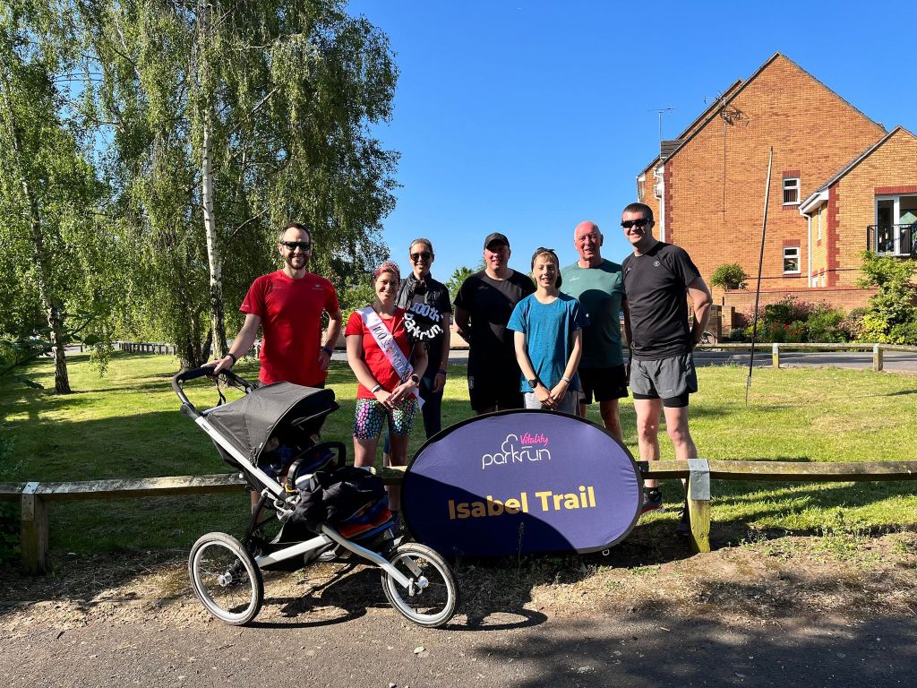 In recent times, Louise has adopted Isabel Trail parkrun in Stafford as her “home” run, and chose this event to run her milestone event, marking it not just by running, but also by volunteering, as she gave the First Timers Welcome on the morning. To help her celebrate the occasion, she was joined by a number of fellow Newport & District Running Club members, and ran wearing a “100 and Fabulous!” sash, a “100” tiara, and a badminton racquet that had been modified with a crocheted cover to let everyone know that she was running her 100th parkrun!