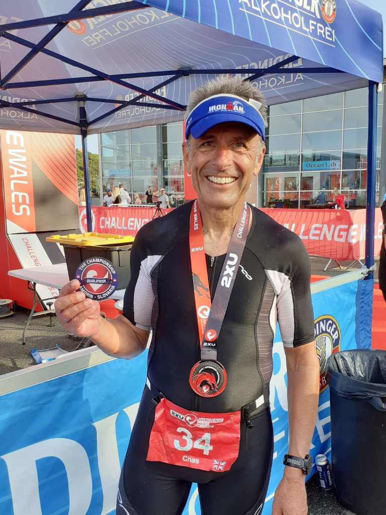 Lots of noise and commotion at the finish as a volunteer passed me a Qualification token for me then to hear over the tannoy that I had come 3rd in my age group and had qualified for the Challenge World Championships in Slovakia next May – wow, a podium place! Not sure what happened, as they had the podium on stage but it was never used – I thought that was to be my one moment of fame, but not to be.