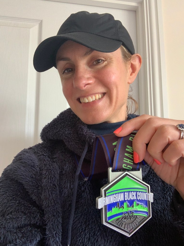 Helen said after the race: “It was cold and drizzly on the day, which was unexpected for a July race, but turned out quite nice conditions to run in apart from a few very muddy parts of the path. The route followed the canal all the way, with a brief stretch going through an industrial area under the M5 but the best part of the race was suddenly emerging into Brindley Place and seeing the Lego giraffe! Unfortunately, there was a diversion in place due to repair work on the canal towpath, which added half a mile to the route, otherwise this would have been a half marathon PB for me.”