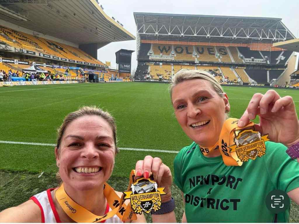 Alison wrote of her and Wendy’s race: “Apart from the Tibberton Trot, this was our first official race! A soggy, drizzly Wolverhampton turned into a perfect dry day for running! Starting and finishing in the Molineux Stadium was fab, and added a unique touch! Wendy had been ill in the run up to the race, and was still struggling with her chest, but did amazingly well to keep going!