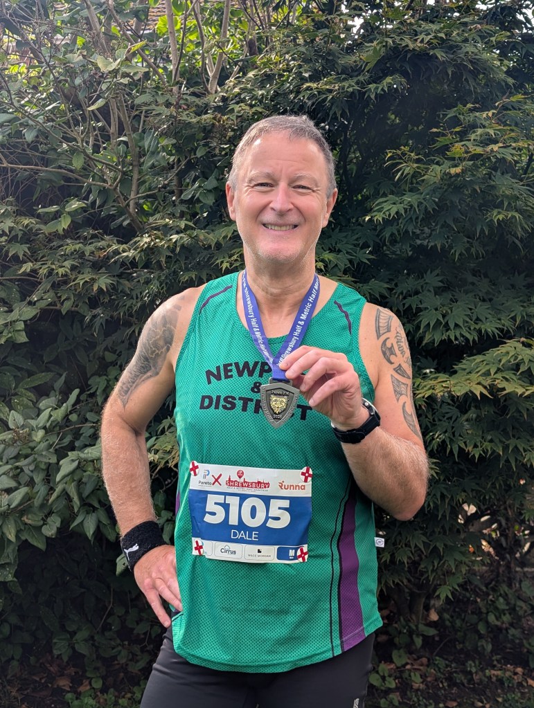 After the race, Dale sent us a report about his experience: ”This was my first attempt at 13.1k. Starting and finishing at The West Mid Showground. The scenic route showcased Shrewsbury’s highlights including the Welsh & English Bridge, Kingsland, Porthill, Coleham, The Quarry, Frankwell, and the picturesque town centre with its medieval buildings and unique streets. A 10 degree, dry overcast morning that later turned to sun. Having never run beyond 12k I set myself a sub 1 hr 10 finish target. I was pleased to cross the line in a chip time of 1hr 8 min 16 sec (1hr 8 min 21 Gun Time). I took full advantage of a free post-run leg massage provided by Move Sports Injury Clinic therapists. I now look forward to Bridgnorth 10k on 19th October.”