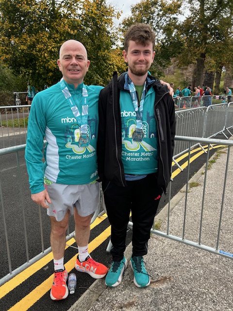 On Sunday, uncle and nephew team David Evans and Alex Cochrane travelled up the A41 to Chester to take part in the annual marathon (David) and metric marathon (Alex). Starting and finishing at Chester racecourse, both races share part of the same course, with the full marathon taking runners on an anti-clockwise lap of Chester and the countryside to the southwest of the city, and the metric marathon running backwards along the marathon course, before taking a u-turn to join the marathoners in an out-and-back configuration.