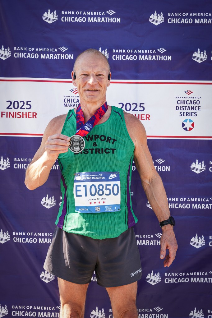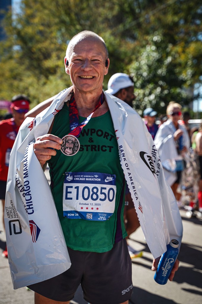 Jonathan sent us this report after the race: “Chicago Marathon was my 32nd marathon; an early morning start in the cool darkness of Chicago, but it was going to be a warm one, and it was. I completed in 3 hours, 40 minutes and 2 seconds (I was 1:43:45 at half way). Not bad for an old one with a cold!