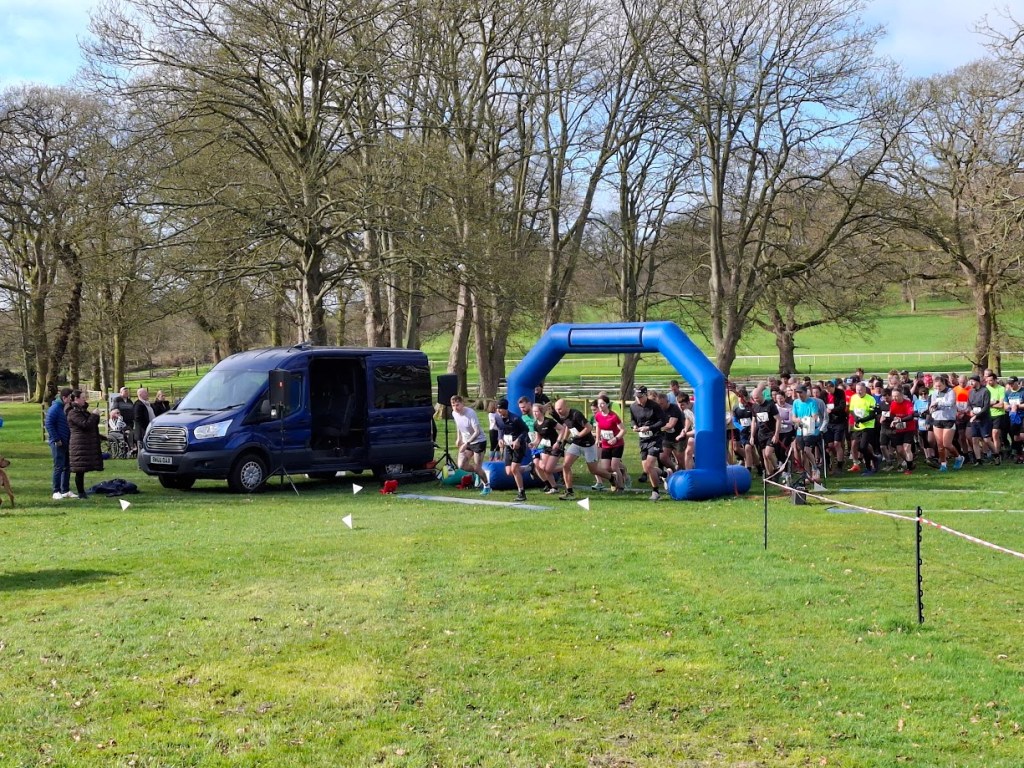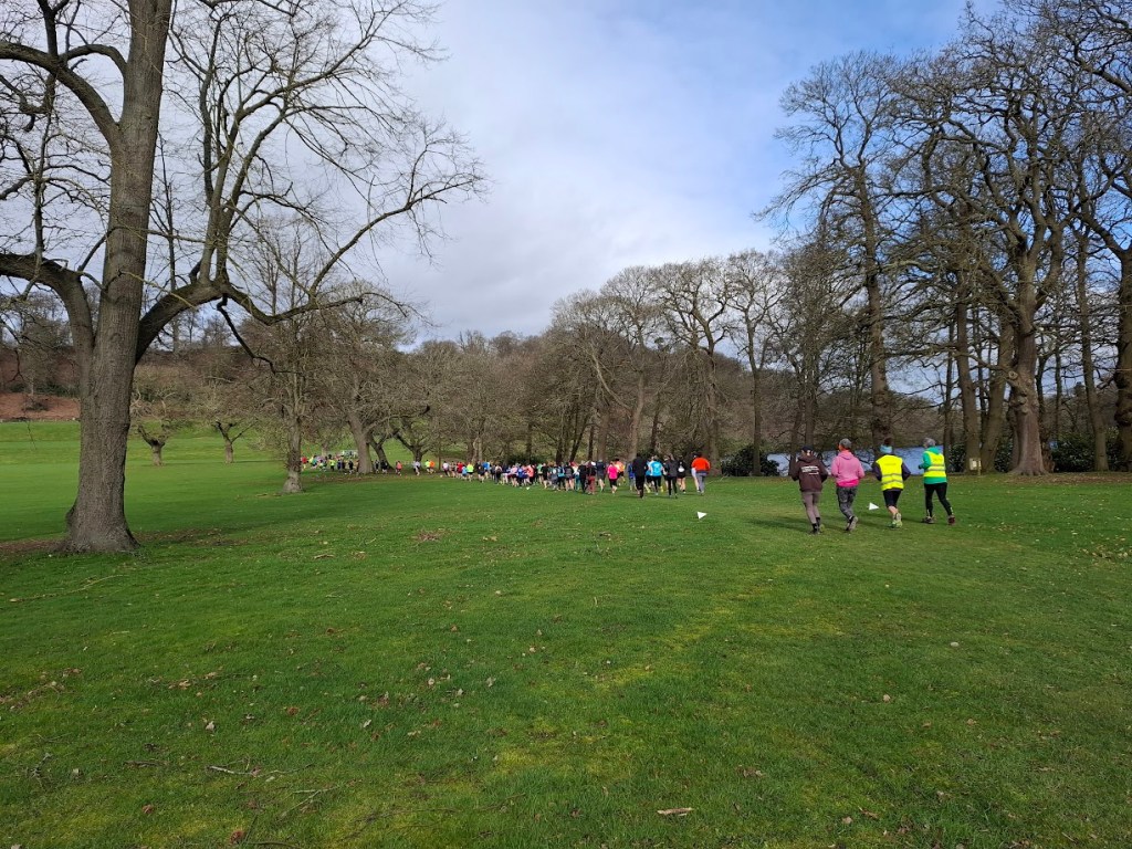 Starting at the south end of Park Pool, runners initially followed the west shore of the lake, before turning left and ascending the escarpment that runs through the centre of the parkland. Once at the top, they turned right and did an anti-clockwise loop of the western fields of the park, before returning down the hill to the start area, and repeating for a second lap before finishing at the same place they started.