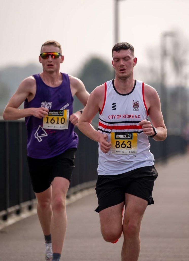 Eventually, the route turned back towards town via the Common Road and the Isabel Trail, before completing a lap of the town centre and finishing on the bridge over the river Sow next to Victoria Park. The start was delayed by 25 minutes this year, due to a backlog queue of runners collecting their numbers. Alex Millington was the first Novaportan runner to finish, taking 12th place overall in a field of well over 2,300 runners, with a rapid time of 1 hour, 16 minutes, 6 seconds. Alex Cochrane was next, and beat his previous personal best by around 8 minutes, taking 104th place in a very fast time of 1:25:50.